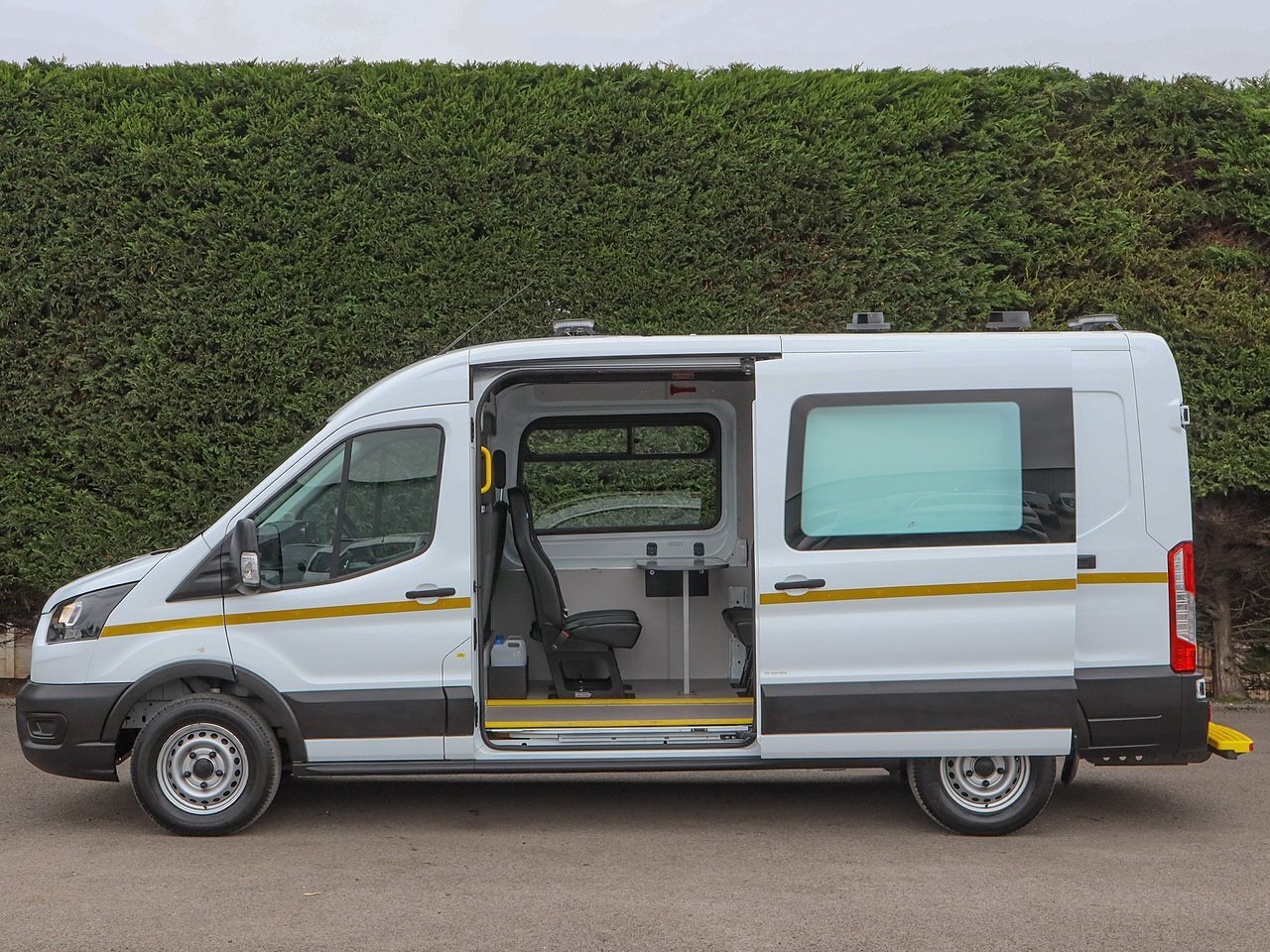 2021 (21) Ford Transit 350 FWD Leader 2.0TDCI, 130ps, 6 Speed, L3H2 LWB 7 Seat Welfare Van, Toilet, DAB Radio, USB, Bluetooth, Eco Mode, Stop Start, Electric Windows, Multi-Function Steering Wheel, Remote Central Locking, Spare Key, 3 Front Seats, Clarks Conversion, Fully Lined Non Slip Floor, 4 Seats Conference Style With Table, 4 USB Points, 400w Microwave, Water Boiler, Webasto Blown Air Heating, Barn Rear Doors, Side Load Door, Thetford Toilet, Sink Hot + Cold To Rear, Running Lights, Rear Step, LED Roof Beacon, Messing Unit, New Wet Belt Fitted, Only 11046 Miles - Ex Contract Lease, ULEZ Compliant